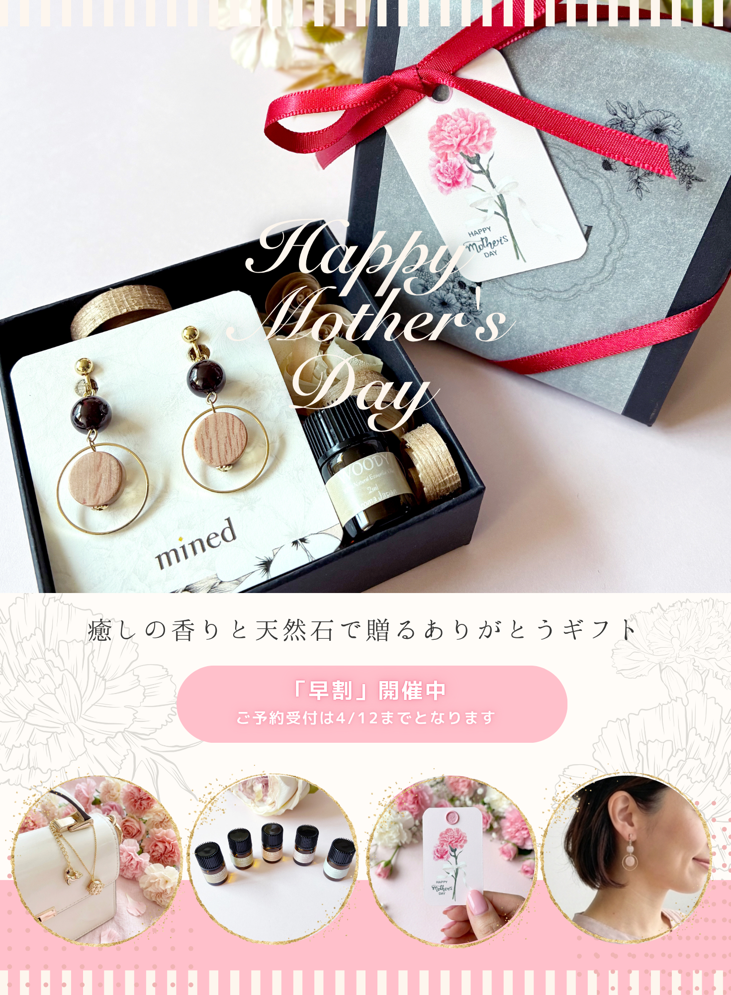 “ありがとう”の気持ちを香りで届ける母の日限定ギフト 天然石イヤリングや猫チャーム付きアロマバッグチャームなど、見た目の美しさと癒しの香りを兼ね備えたハンドメイドアクセサリーを揃えました 毎日を忙しく過ごす50代・60代のお母さんに、ほっと深呼吸できる香りの時間をプレゼント 誕生石の意味やアロマの香りに込められた“やさしさ”“安らぎ”が、あなたの想いをそっと伝えます 今年の母の日は、モノ以上の体験を贈りませんか? 4月12日までの早割開催中で、母の日特別ラッピングとミニアロマボトルをプレゼント! 香るイヤリング、猫のチャーム、手書きのサンキューカード──世界にひとつだけの「香りでつながる母の日ギフト」をお届けします