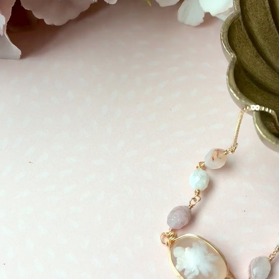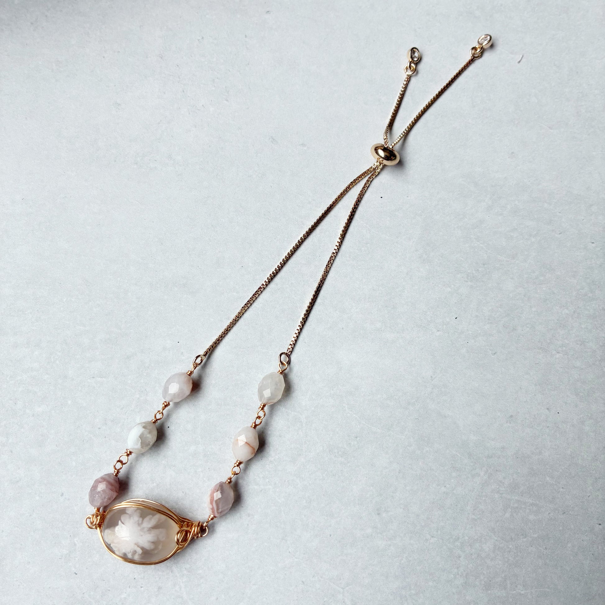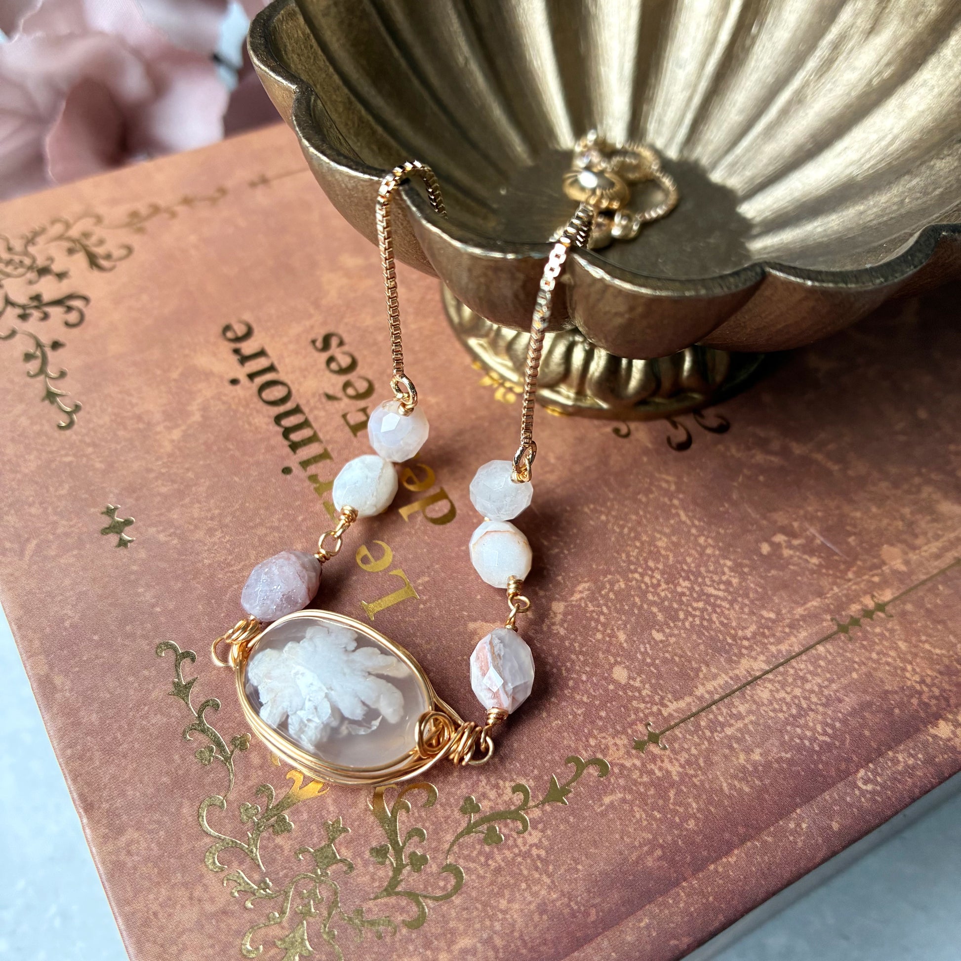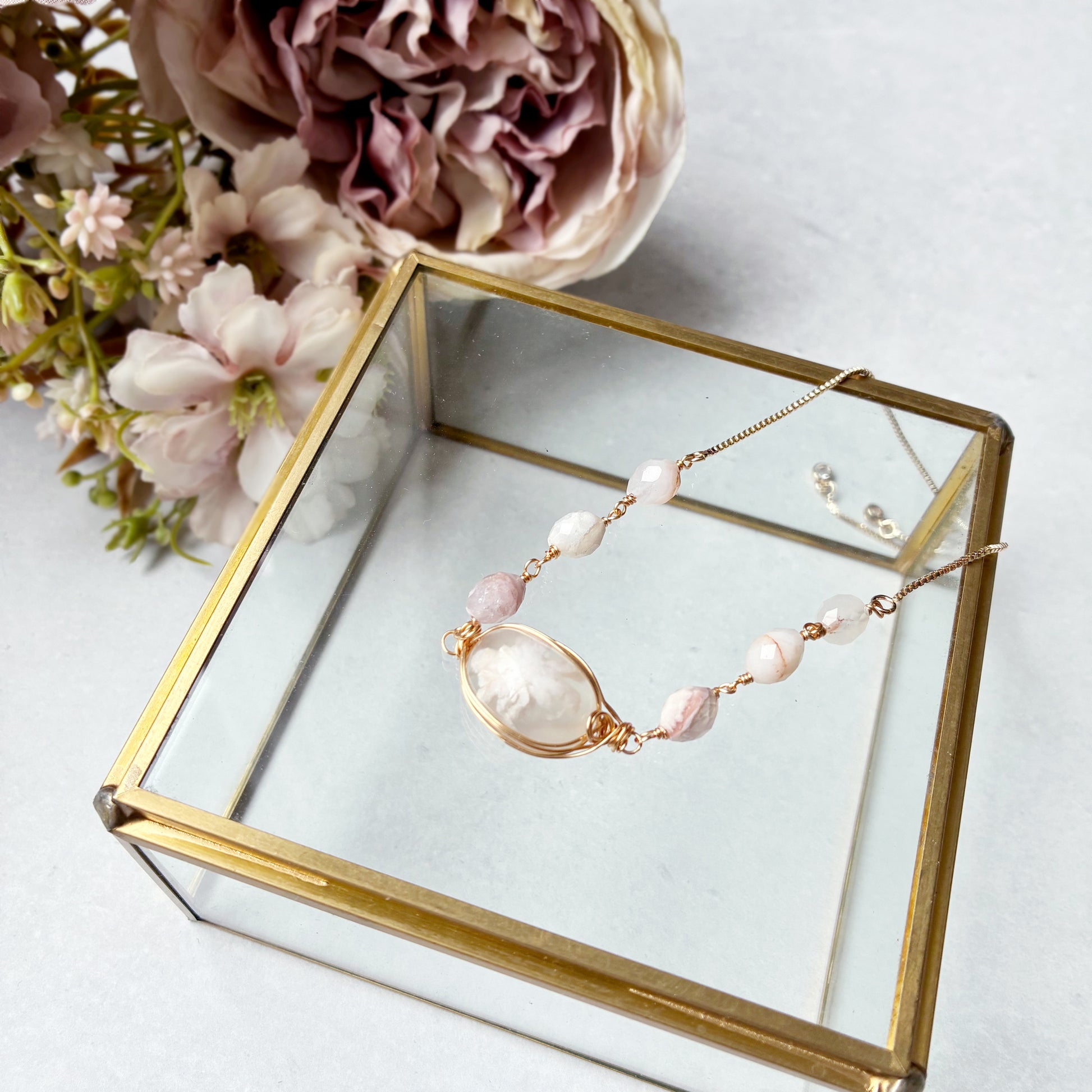 チェリーブロッサムアゲートは、石の中に本物の桜の花びらが舞い落ちたような、幻想的な模様を持つ天然石です
